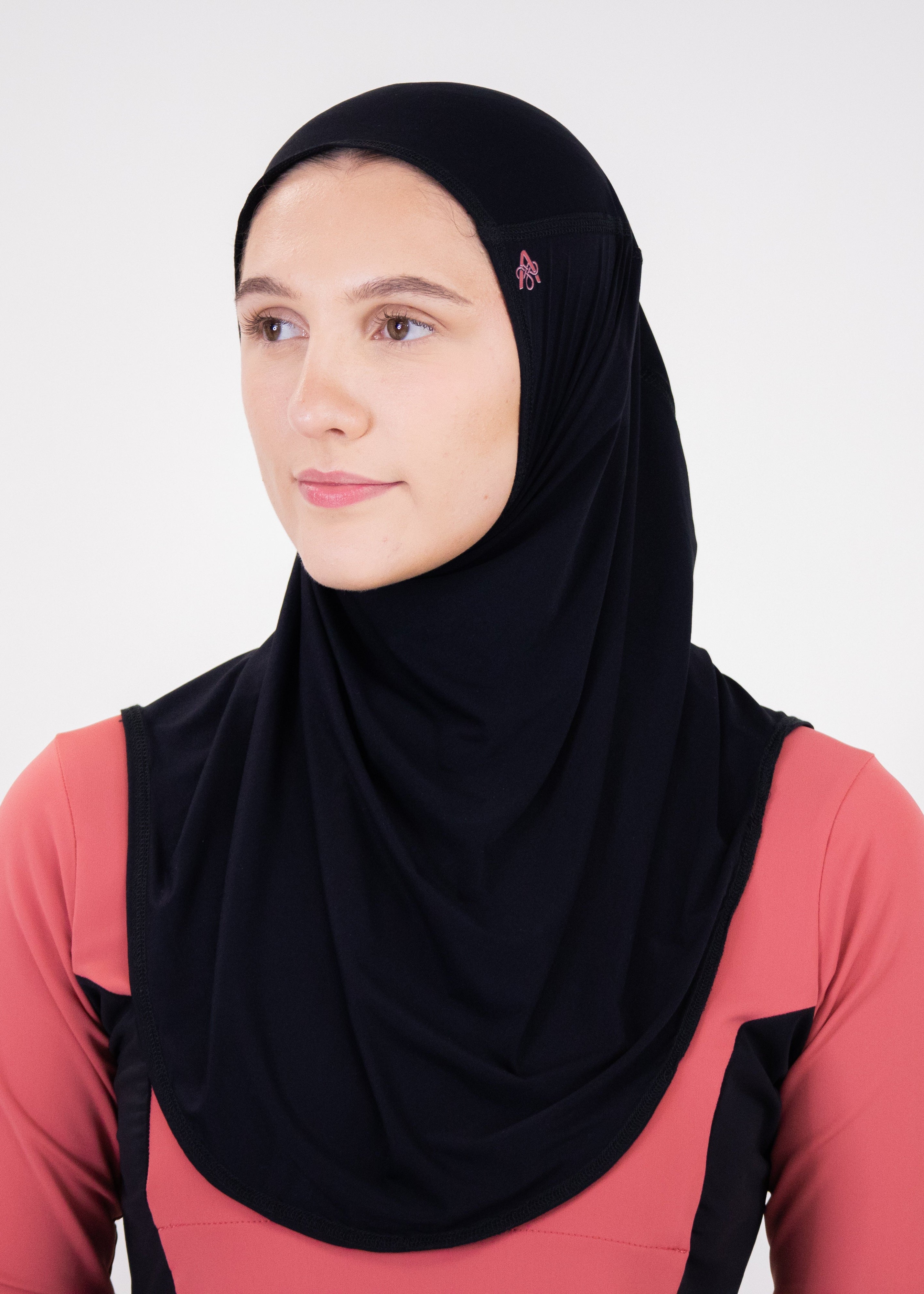 Description: High performance sport hijab with asymmetrical left seam and logo detail.