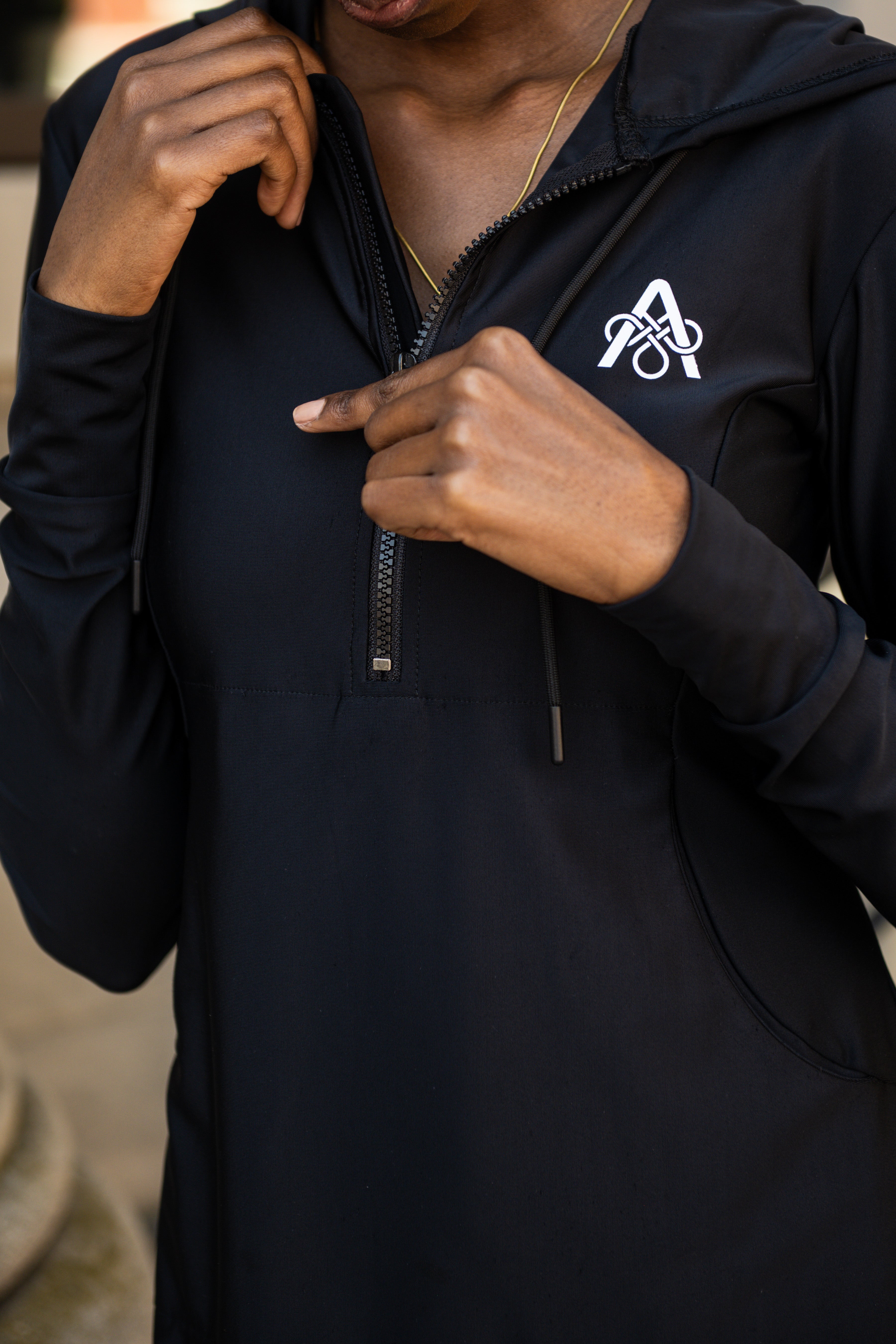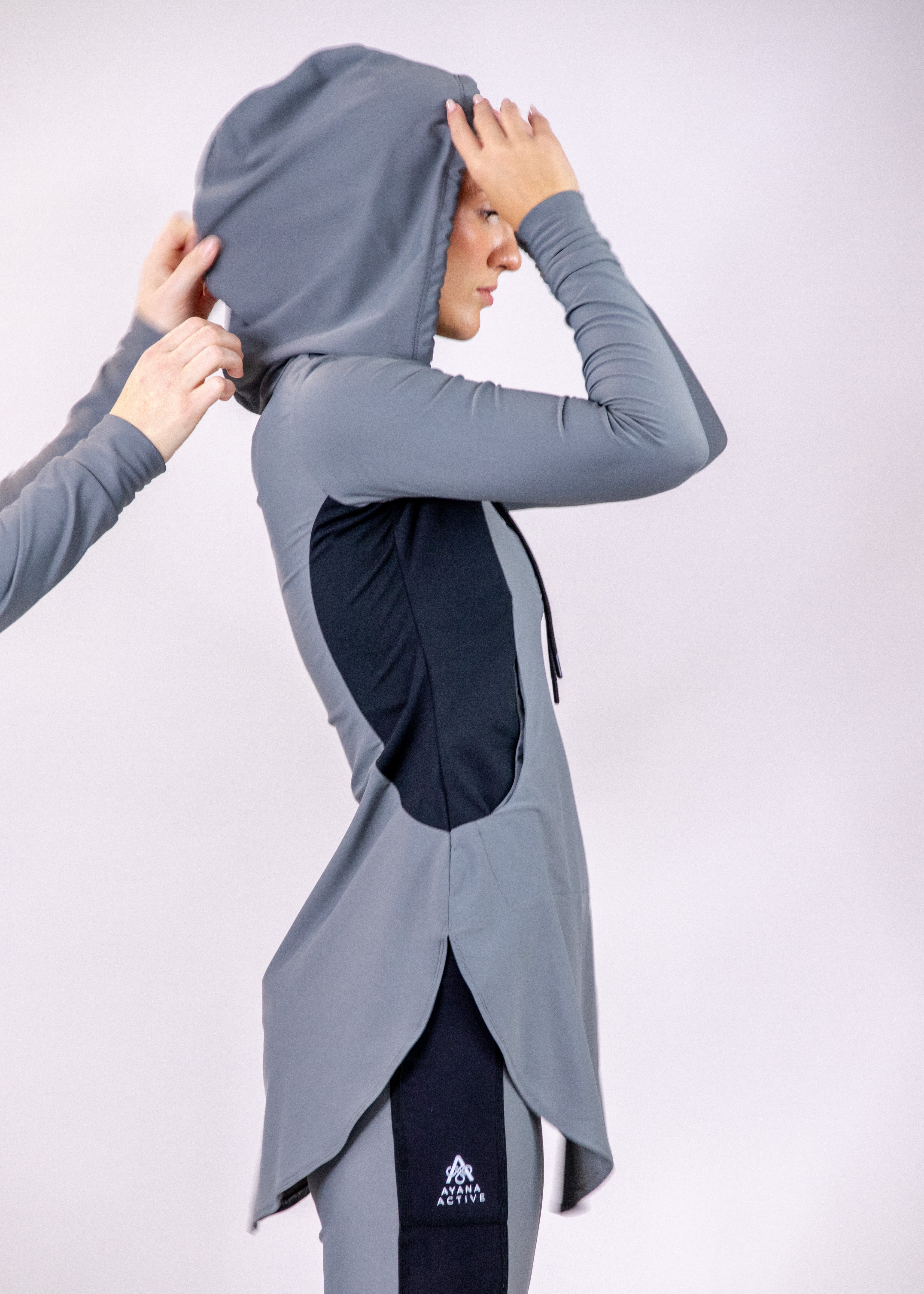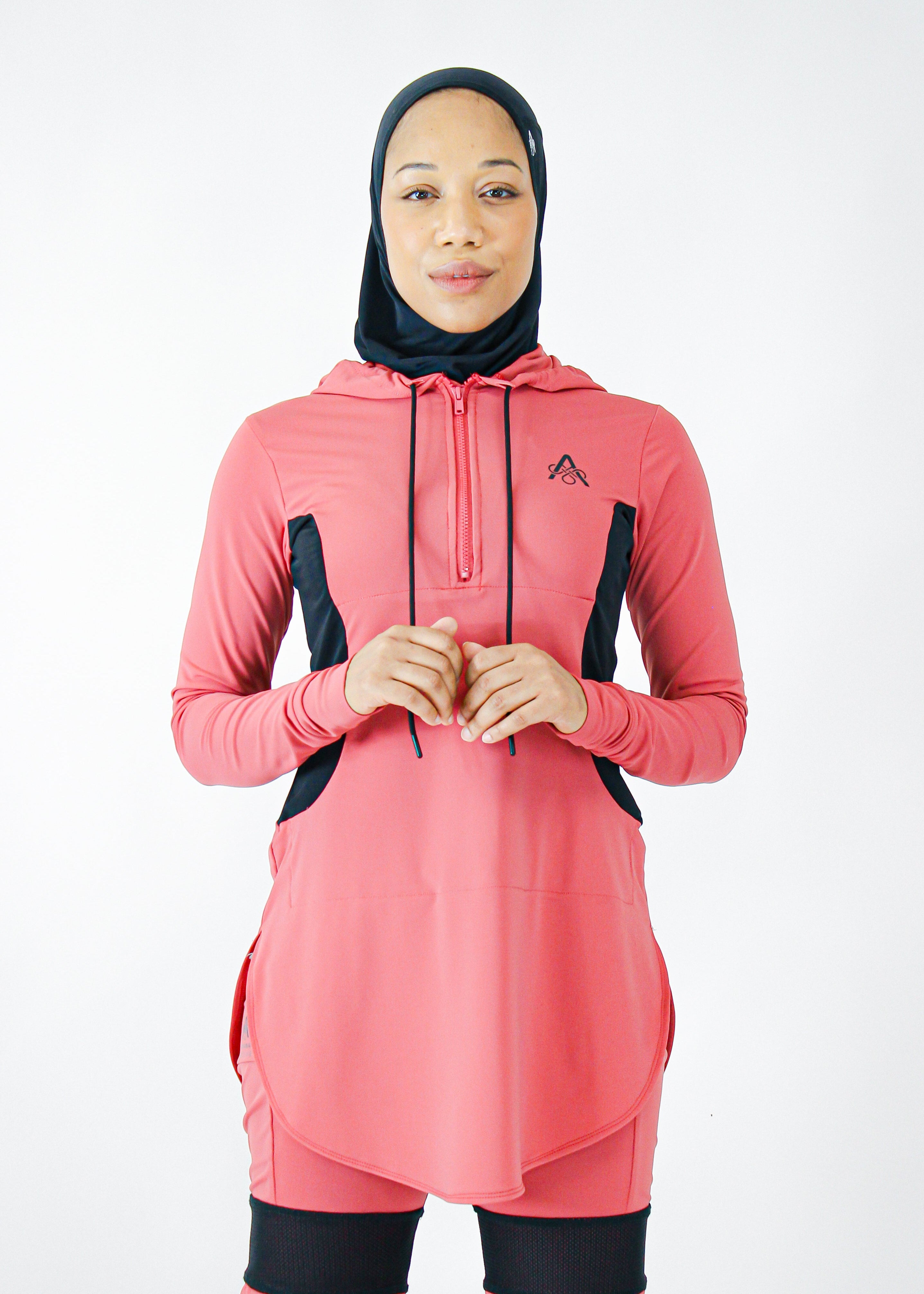 Description: Performance tunic with hood, front zipper, princess seams, front pocket, cuff, and rounded shirt bottom.