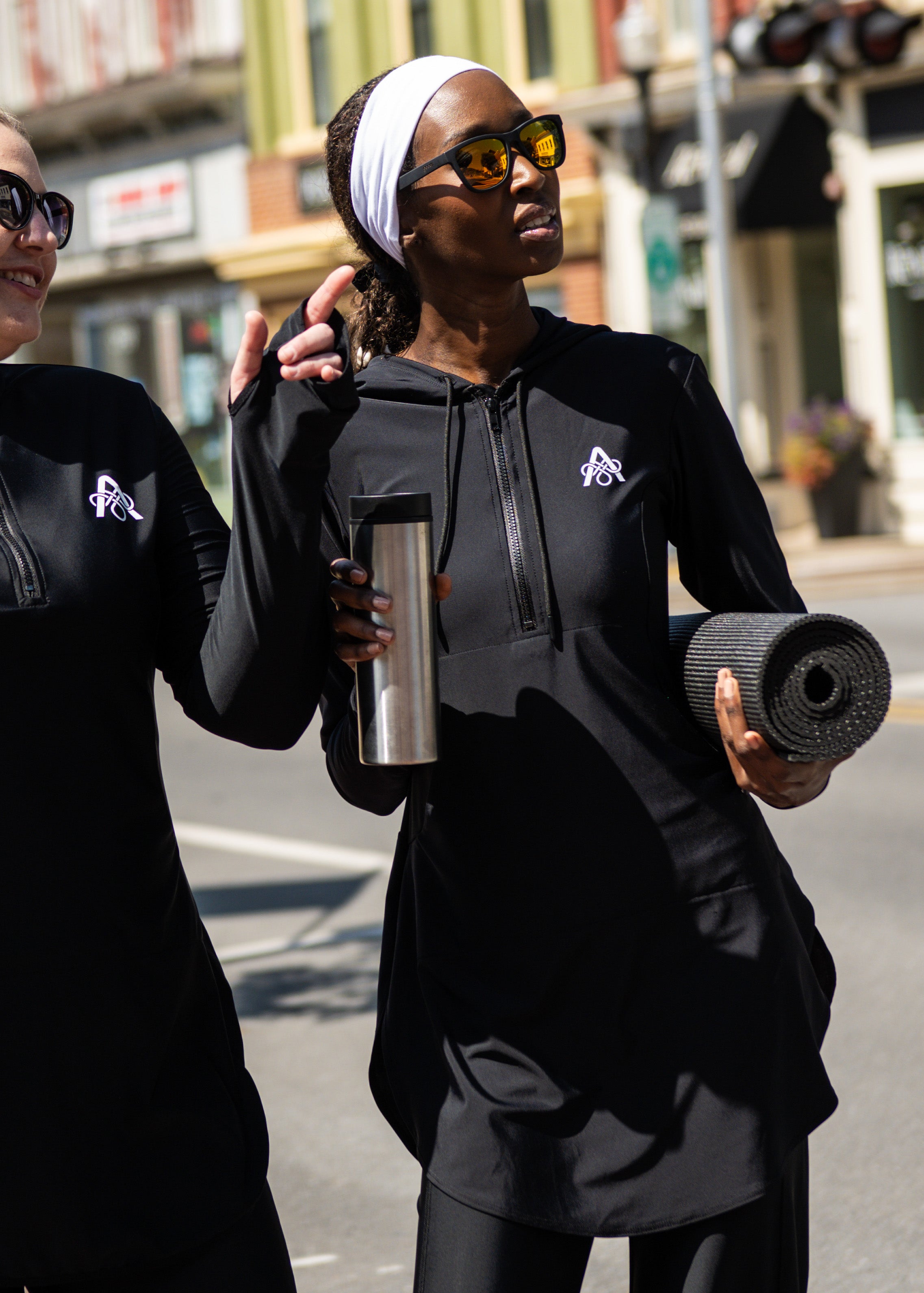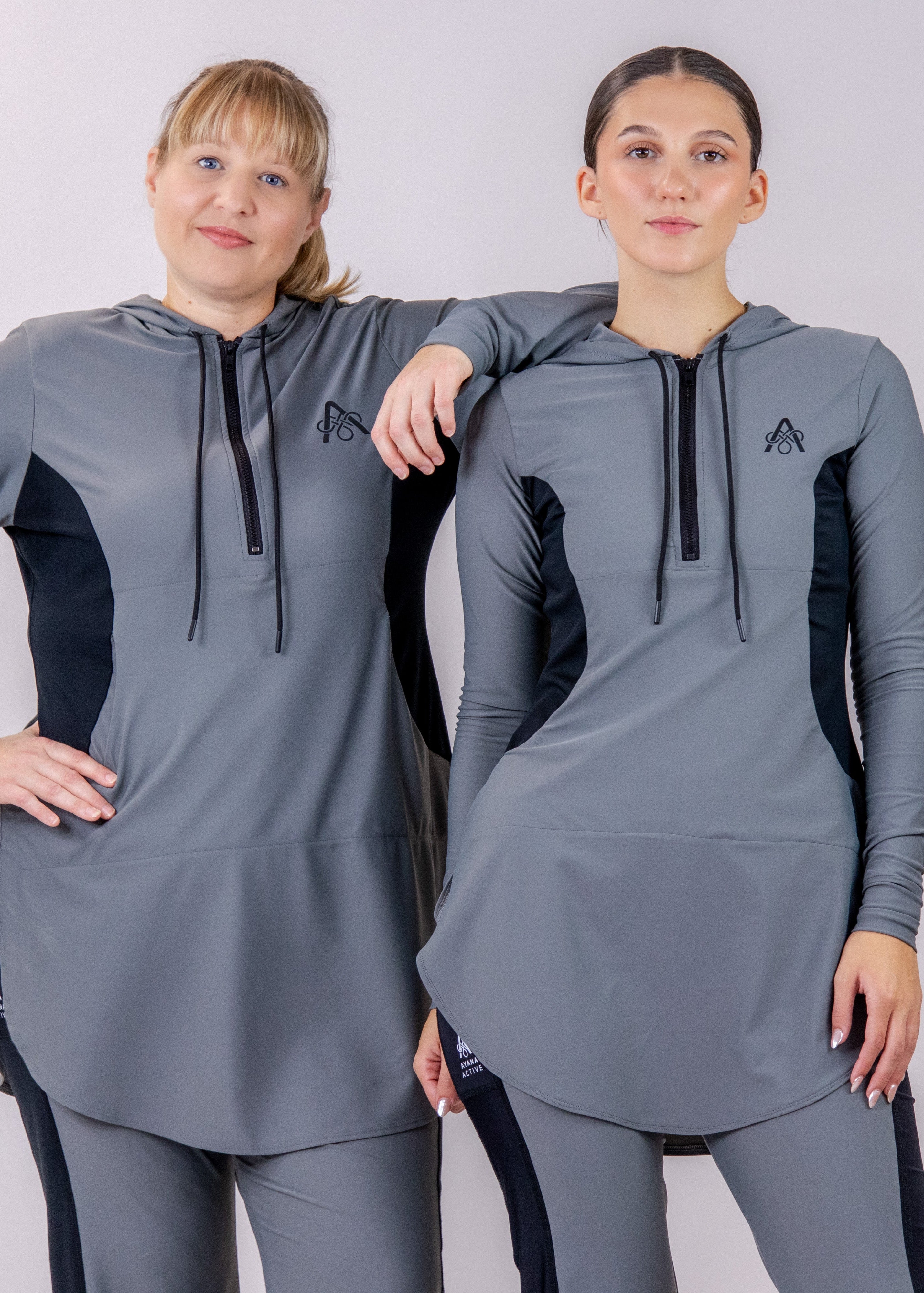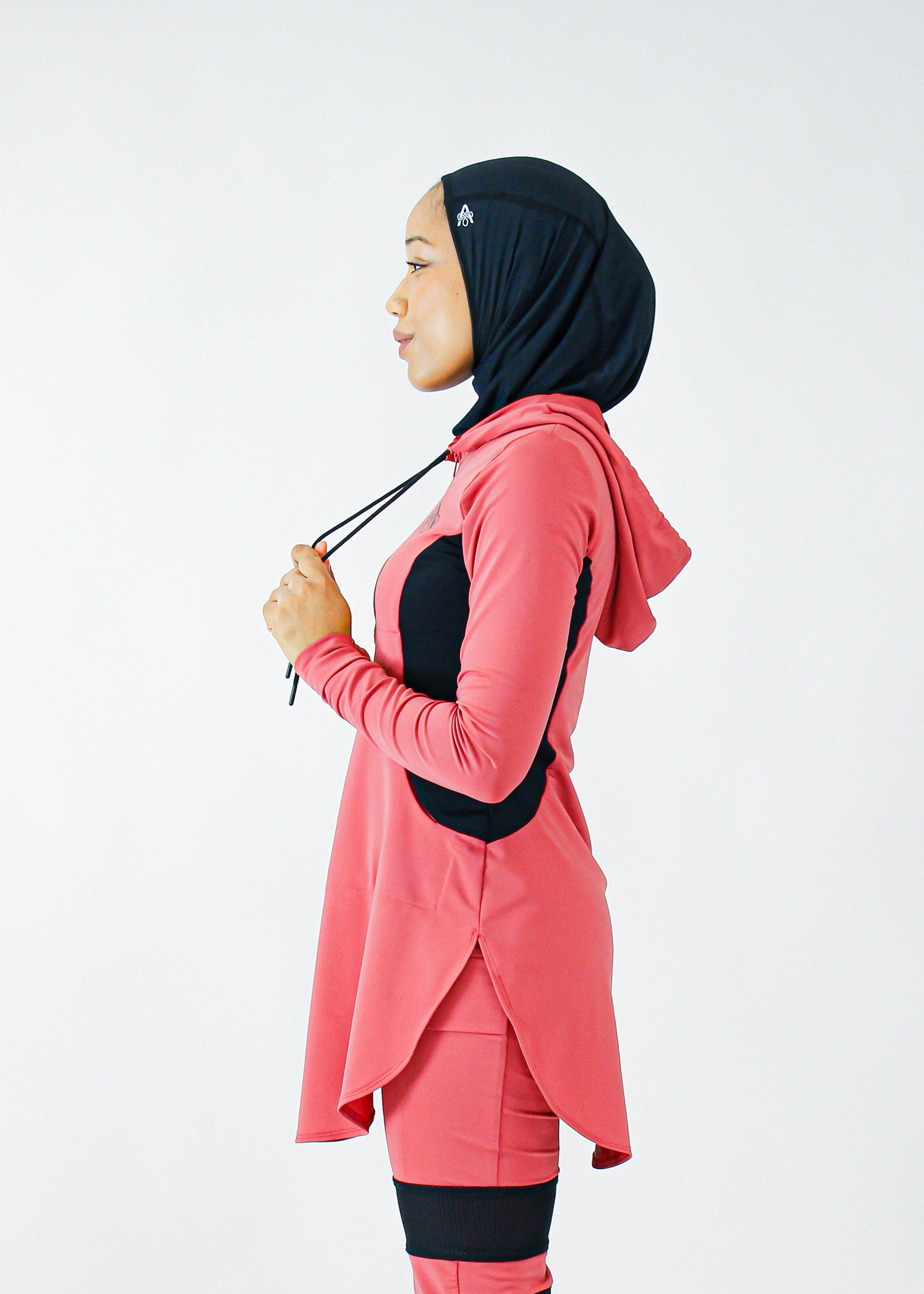 Description: Performance tunic with hood, front zipper, princess seams, front pocket, cuff, and rounded shirt bottom.