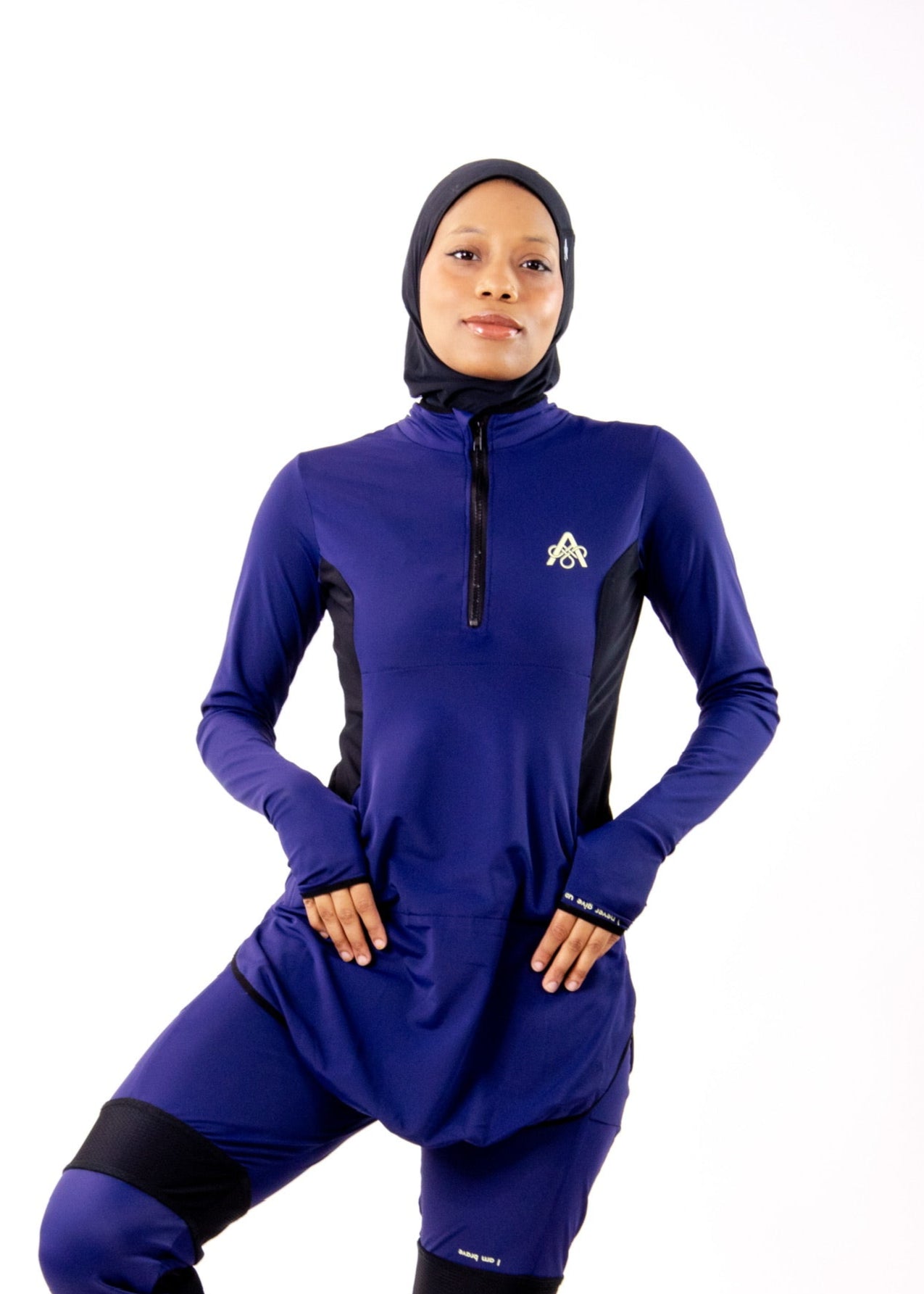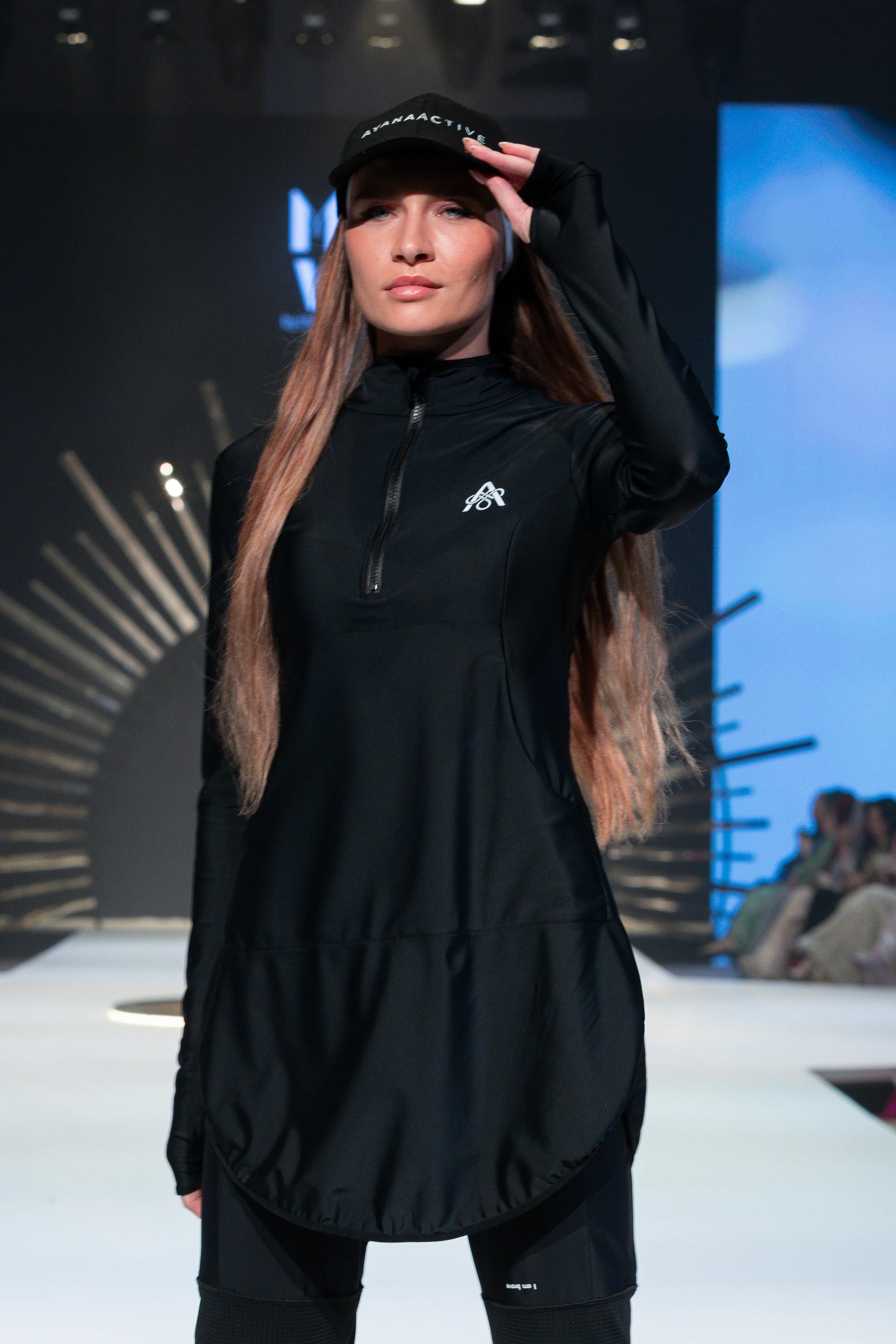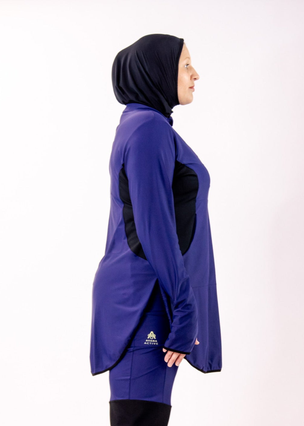 Description: Performance tunic with collar, front zipper, princess seams, front pocket, thumbholes, rounded shirt bottom with gather, and double over elastic (on collar, sleeves, and hem).