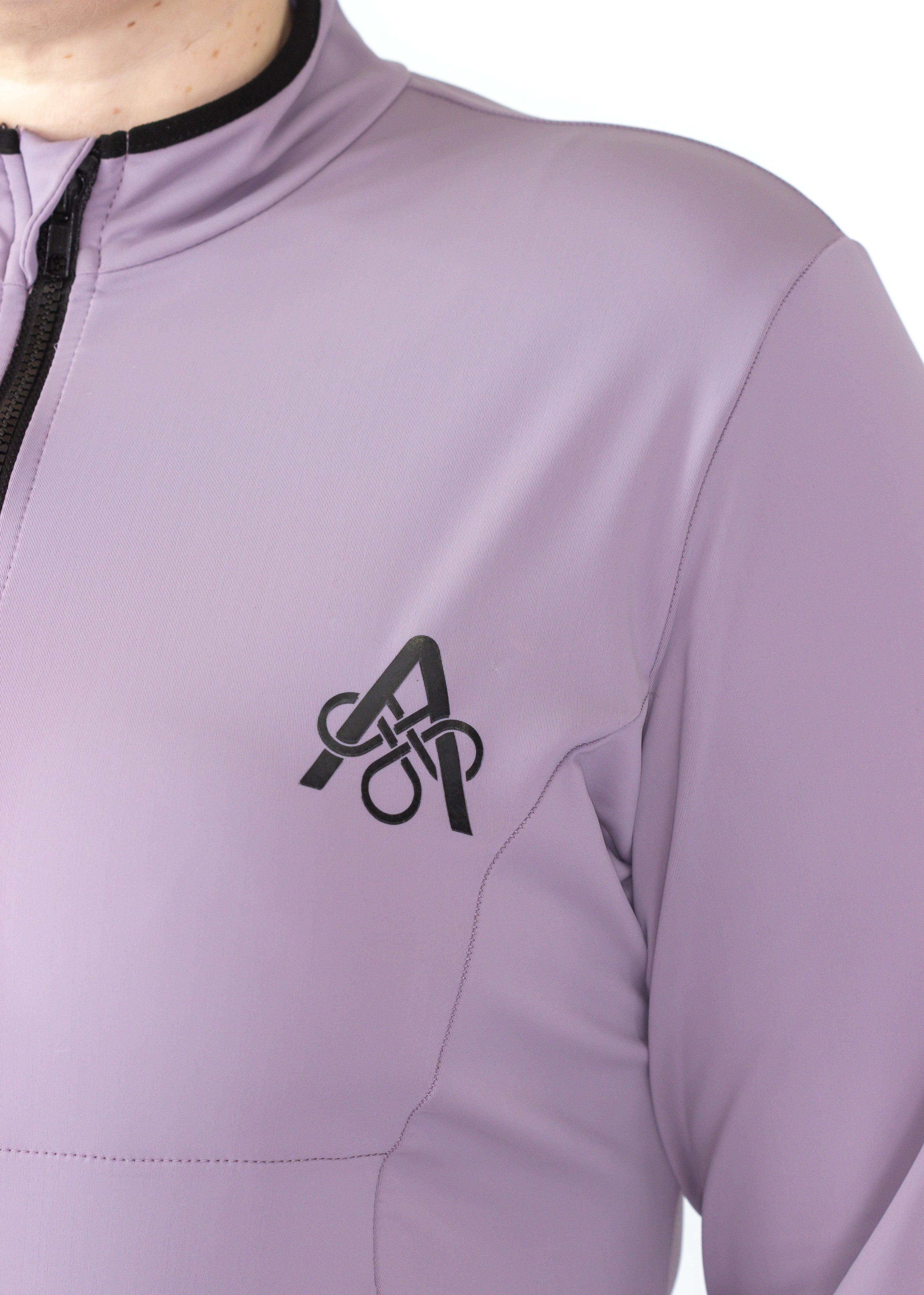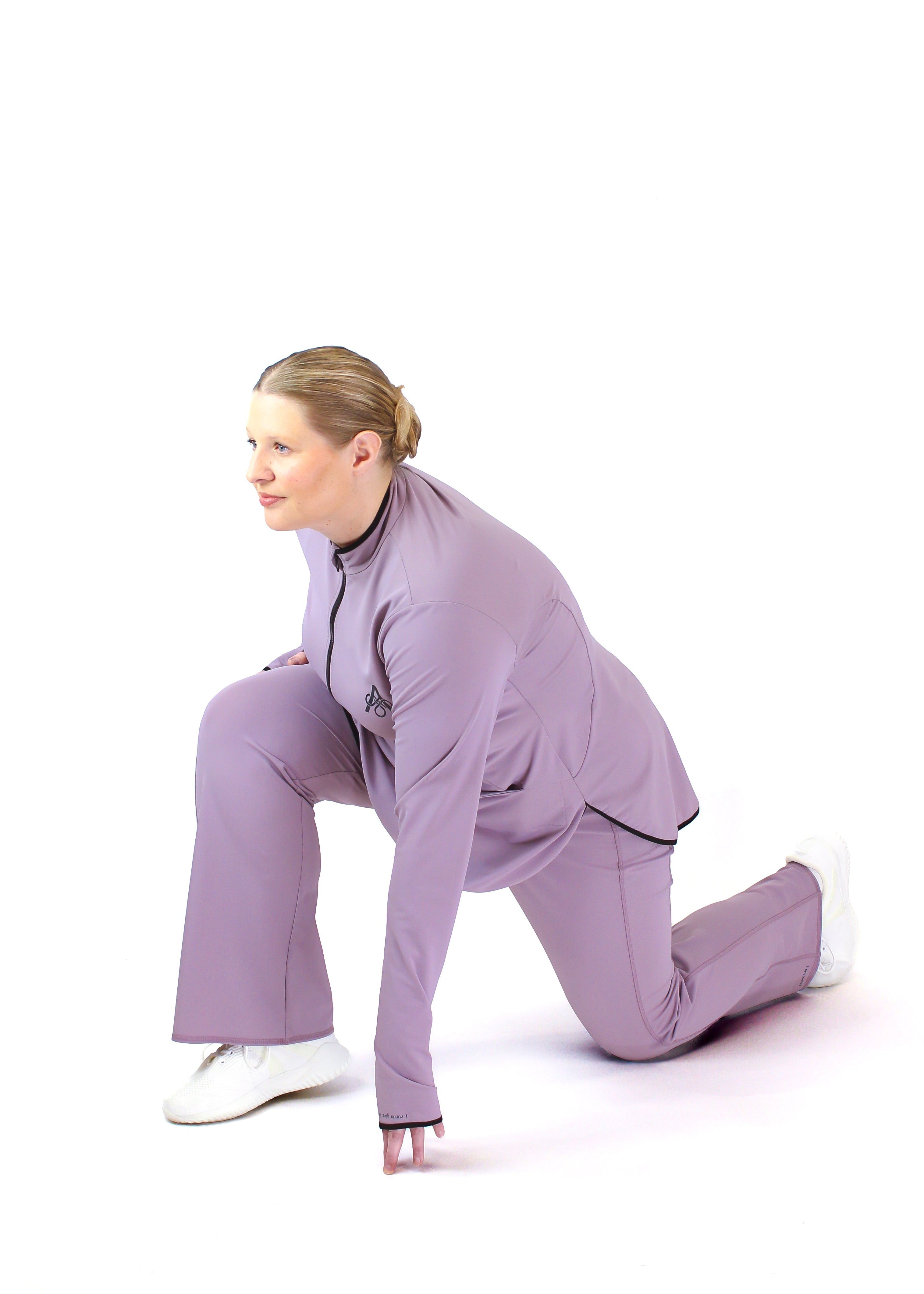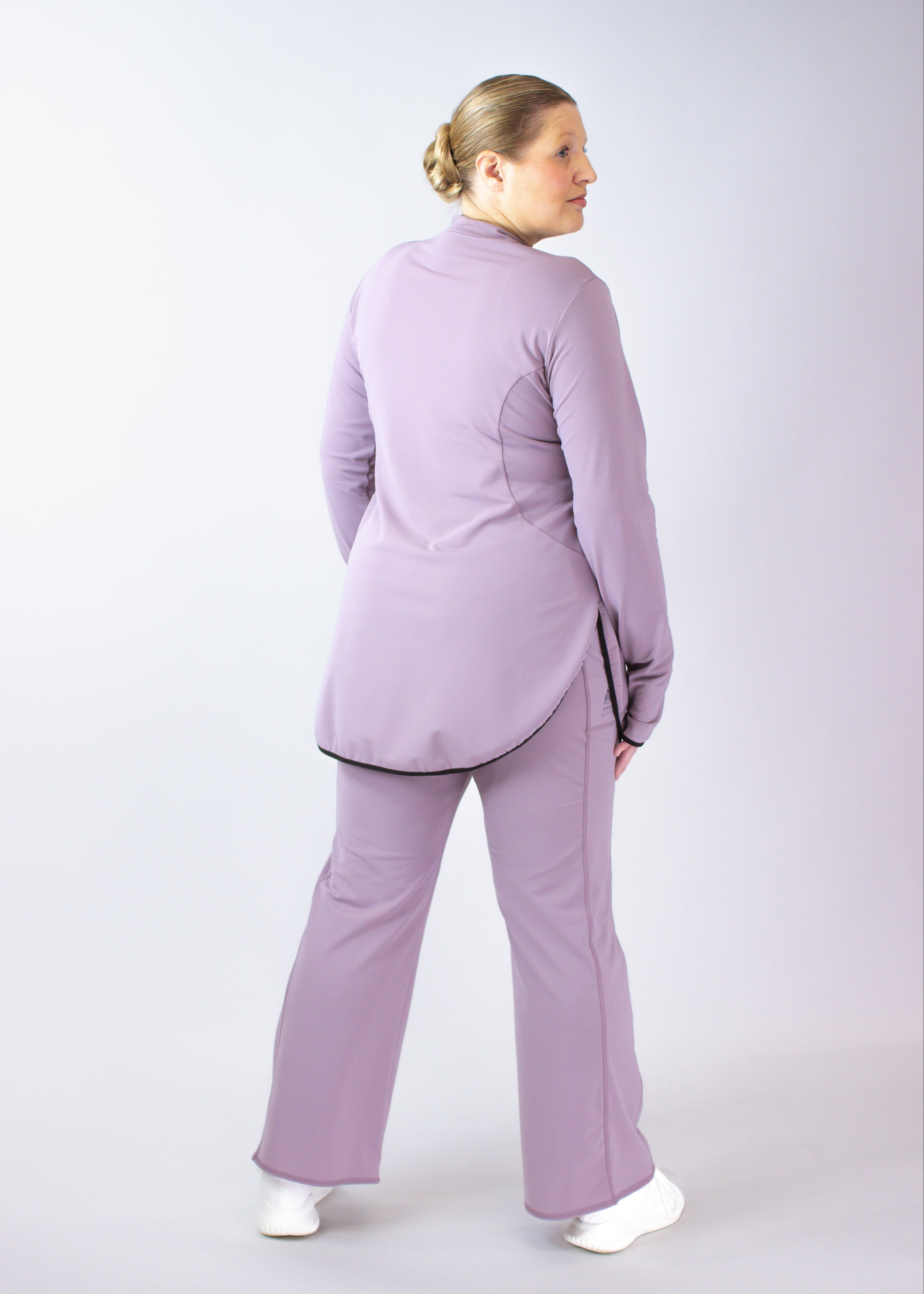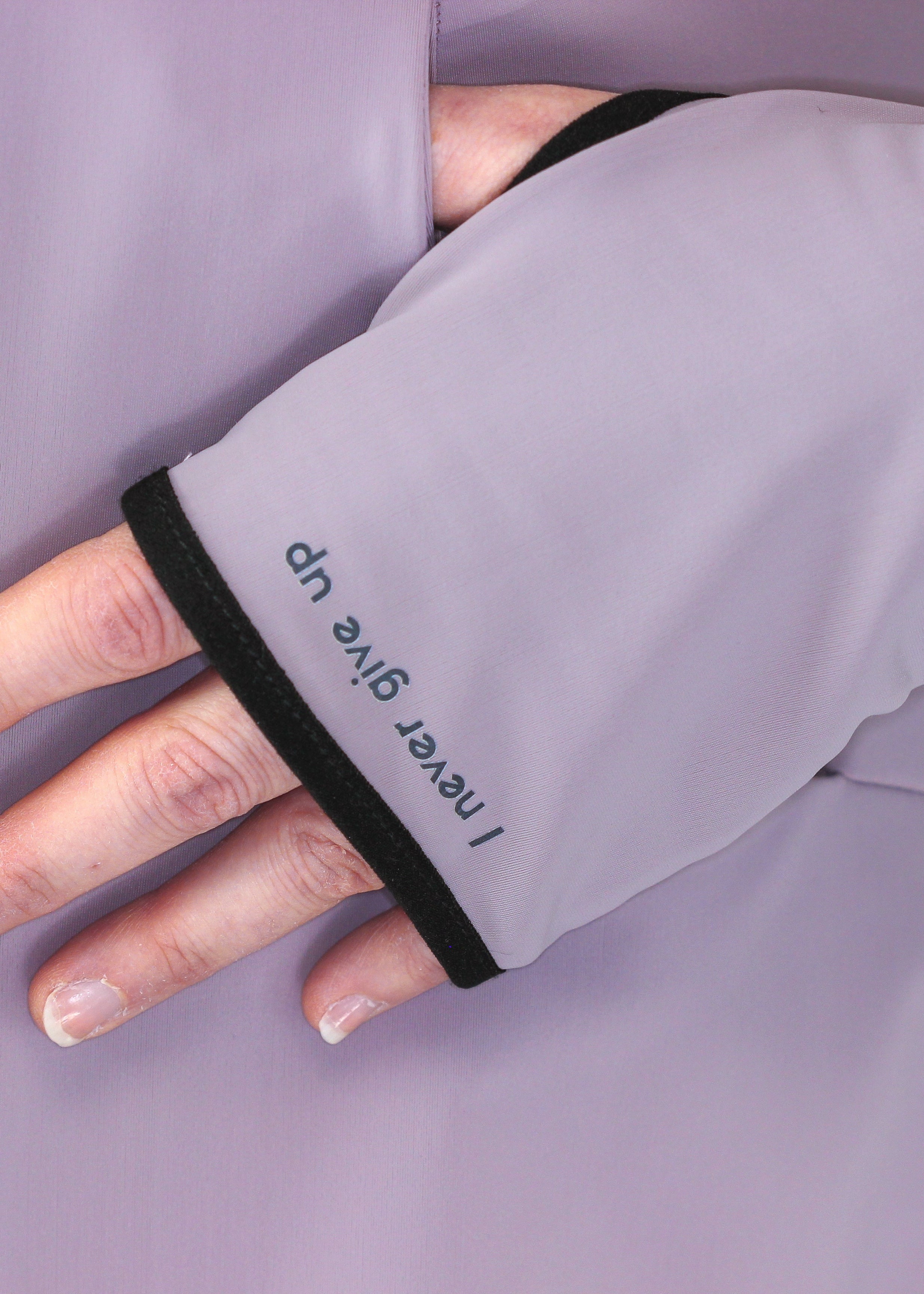 Description: Performance tunic with collar, front zipper, princess seams, front pocket, thumbholes, rounded shirt bottom with gather, and double over elastic (on collar, sleeves, and hem).